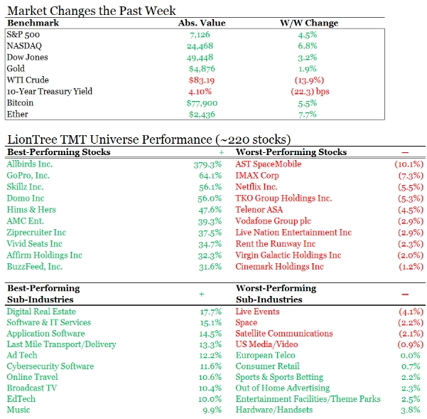Re-assuring comments regarding consumer spend resiliency and limited impact thus far from the geopolitical backdrop from key bank earnings this week also helped the market. TMT earnings also kicked off with heavy-weight Netflix reporting, though investors had hoped for more (see Theme #1). Sector prints will start to ramp next week.