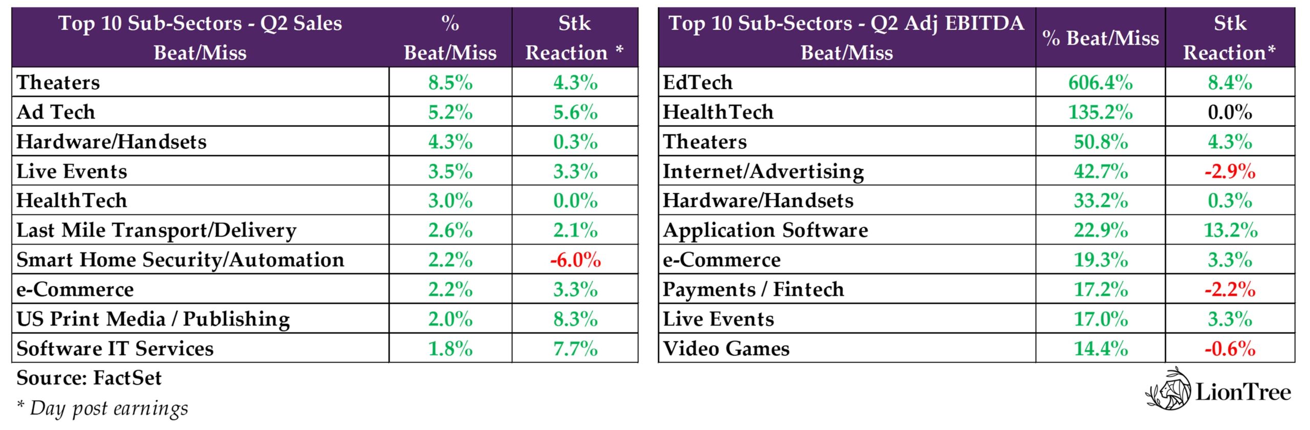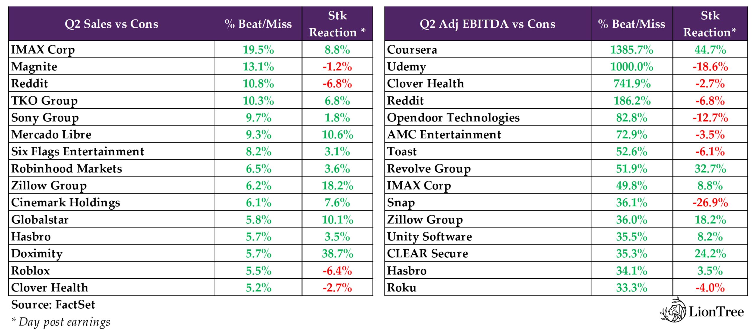- Adj EBITDA – Of the companies in our LionTree Universe that report adj EBITDA, 82% beat on consensus adj EBITDA, and 55% had double, triple, or quadruple-digit beats