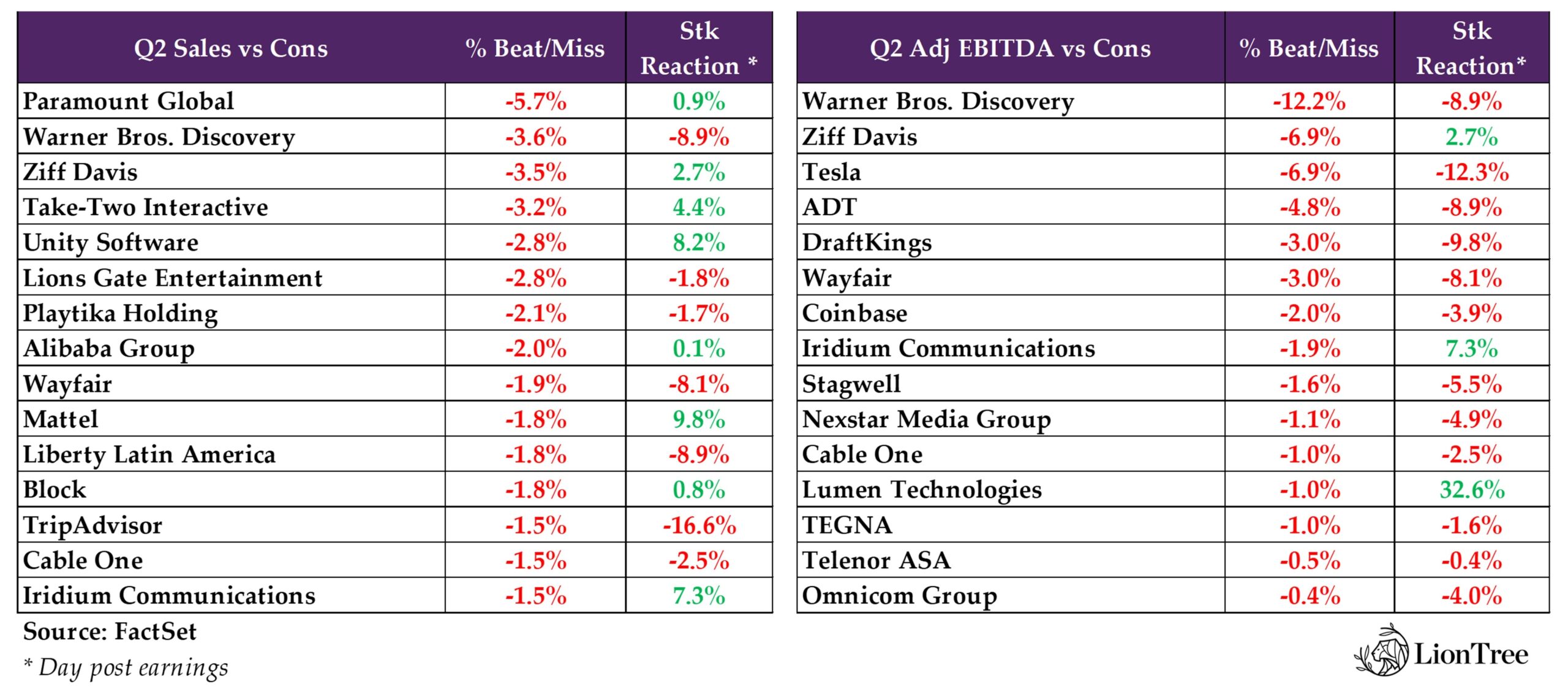 - Adj EBITDA – Of the companies in our LionTree Universe that report adj EBITDA, 18% reported numbers in-line/lower than consensus adj EBITDA