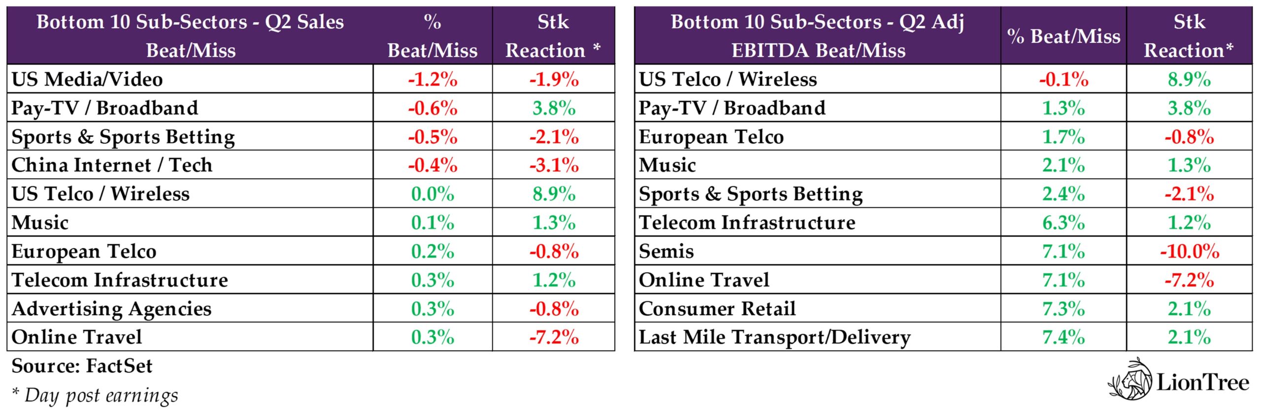 As we reached the end of a whirlwind Q2 earnings season, we took a look at Q2 results across our LionTree TMT and Consumer Universe of ~150 companies (30 sub-sectors) with $1bn+ market cap to highlight the highs and lows of the qtr.