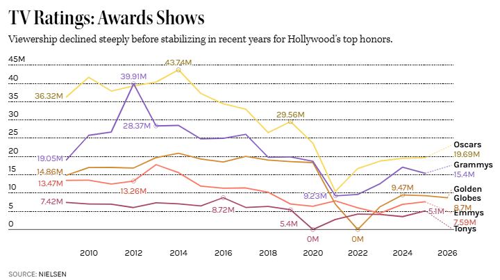 - A. film, TV and commercial production showed no rebound in Q4 2025, per FilmLA data. Production days fell 12.3% q/q, extending a decline cont’d since 2022, w/ total shoot days stagnant since 2021. Despite $771mn in state incentives annc’d and allocated, impacts aren’t visible yet, as overall volume is ~50% of 2019 levels, subsidies rose in TV, but film and TV metrics remain sharply below 5-yr averages. (Variety)