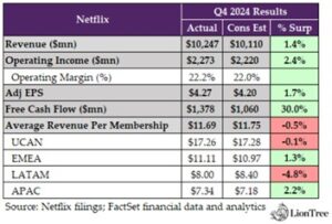 Netflix not only beat on its top-line, but also added its biggest quarterly subscriber gain in the company’s history (18.9mn). It was a pivotal qtr for Netflix as its live strategy was truly put to the test with the Paul vs. Tyson fight and 2 NFL Christmas Day football games, and the effort paid off, with both events creating viewership records. That said, mgmt made a point to highlight that these events only drove “a small minority” of the 18.9mn subscriber adds.