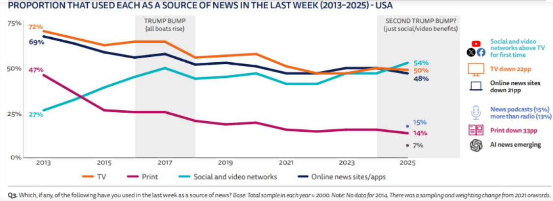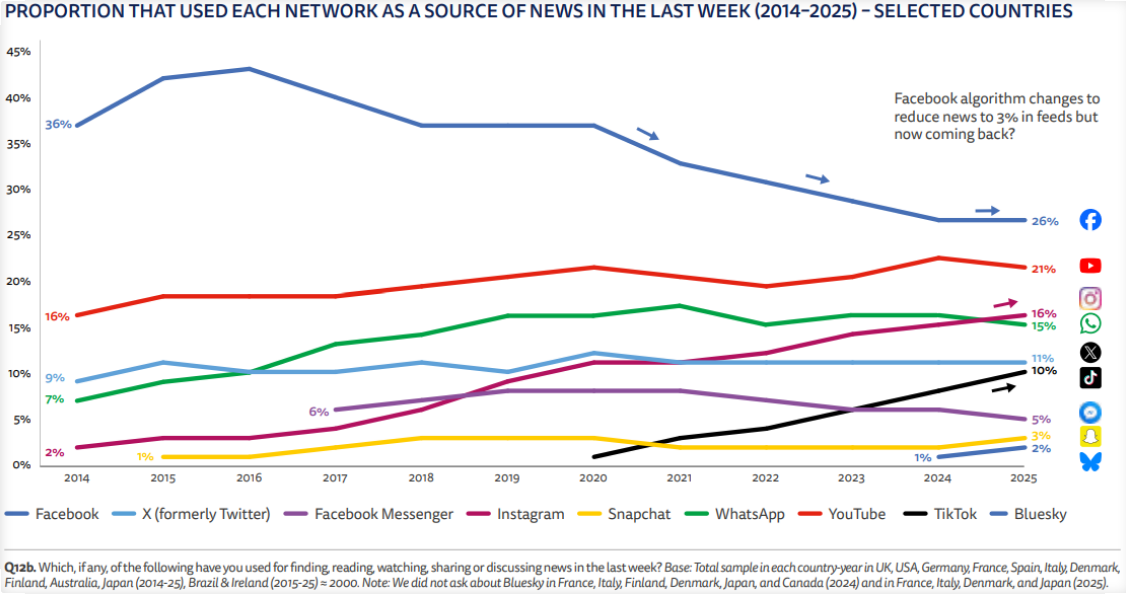 - News access is more fragmented than ever: 6 platforms now reach 10%+ of users weekly (up from just 2 a decade ago – Facebook and YouTube)