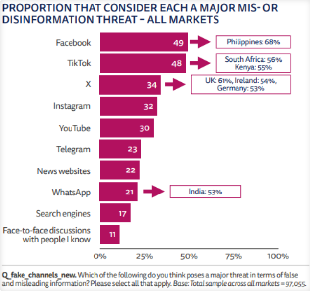 - Facebook and TikTok are considered top sources of misinformation across all markets
