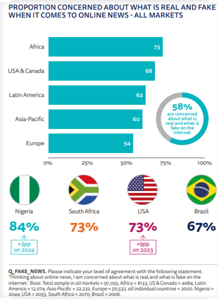 - Concerns regarding misinformation remain high – 58% of people are concerned about distinguishing real from fake news online