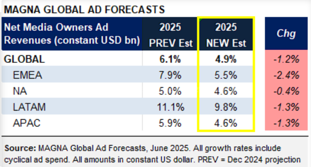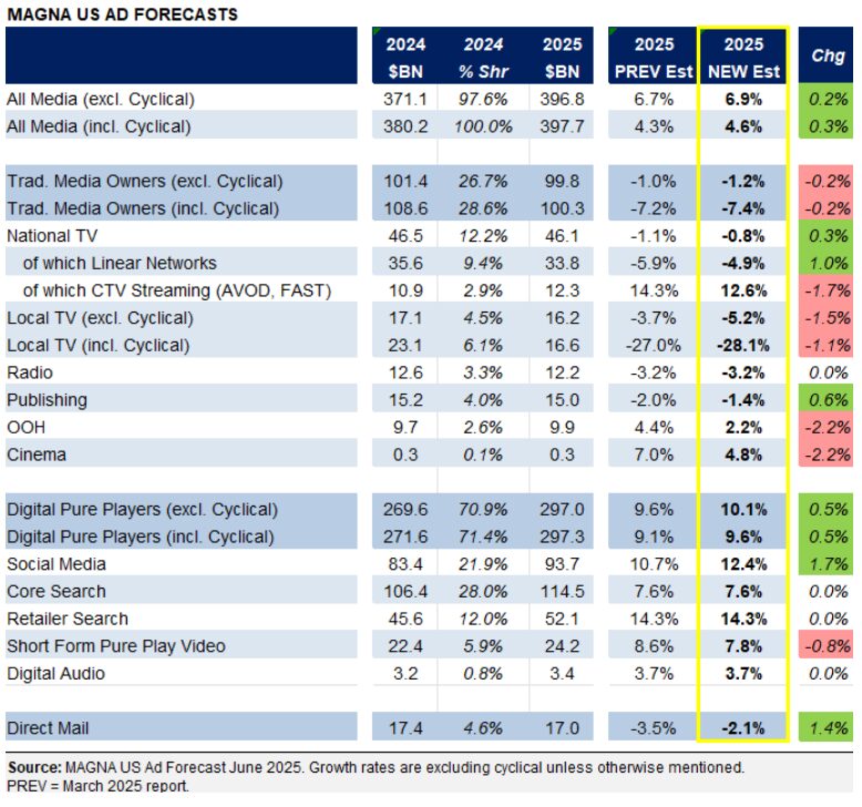- Magna’s 2025 US ad growth estimate (incl cyclical events) was raised from +4.3% (as of March) to +4.6%, but it is still below the +5% growth forecast as of the start of the year