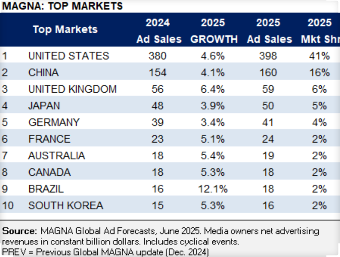 - The US ad mkt will grow +4.6% to $398bn (ex-cyclical +6.9%) as mentioned above – it remains the largest ad mkt in 2025, accounting for 41% of global ad spend, followed by China (17%), Japan, the UK, and Germany