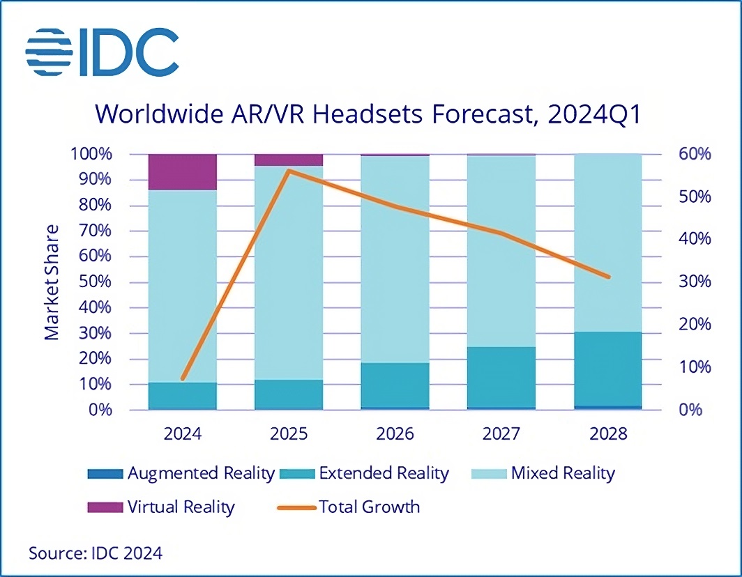 - Global shipments of AR/VR headsets declined -67.4% y/y in Q1:24, though the decline in shipments was expected as the market transitions to include new categories such as Mixed Reality (MR) and Extended Reality (ER); This is as per new data from the International Data Corporation’s Worldwide Quarterly Augmented and Virtual Reality Headset Tracker