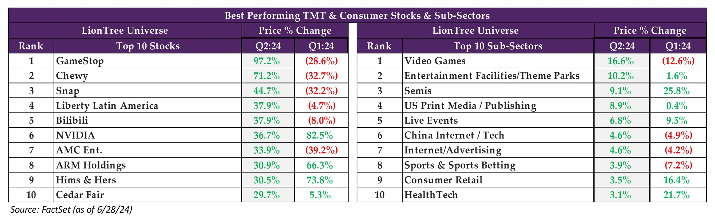 - #1 = Video Games: After falling -13%, on avg, in Q1, the sub-sector reversed course and was up +17%, on avg, in Q2