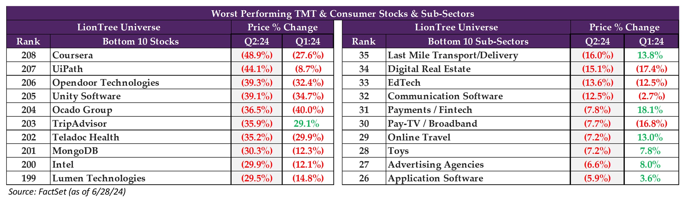 Looking at performance across our LionTree Universe of ~200 stocks in the TMT and Consumer sector with $1bn+ market cap, it was tough going, with just 43% of stocks trading up in the quarter, vs 52% in Q1 and 77% in Q4. More interestingly, almost a third (~32%) of stocks traded down double-digits, which is even higher than last qtr’s 29% and Q4’s ~10%.