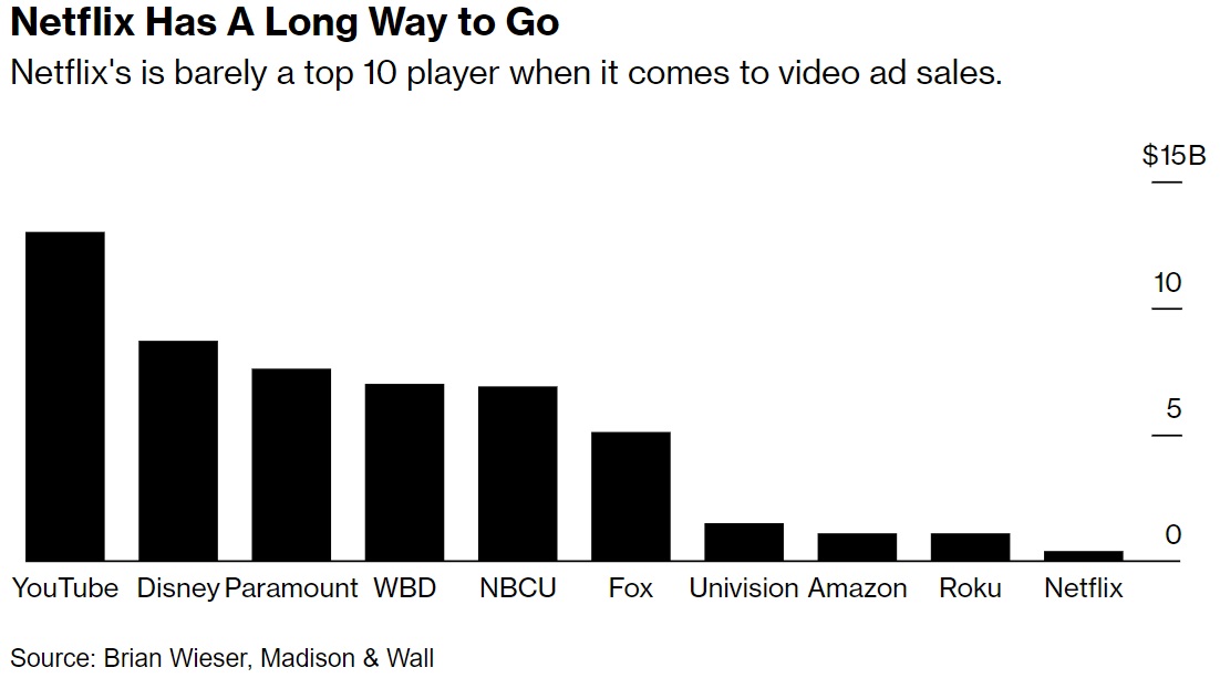 - A new free ad-supported plan could potentially help address one of the Co’s biggest challenges – creating more ad inventory: Per an ad exec cited by Bloomberg, “They’ve been slow to scale” and “there is not a clamoring for them” given that Netflix is at best the ninth or tenth biggest player in online video advertising, and has been trying to charge as much as twice as the competition
