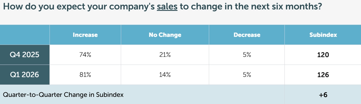 - Expectations for sales INCREASED +6pts to a value of 126 (signaling further growth from Q4 to Q1)