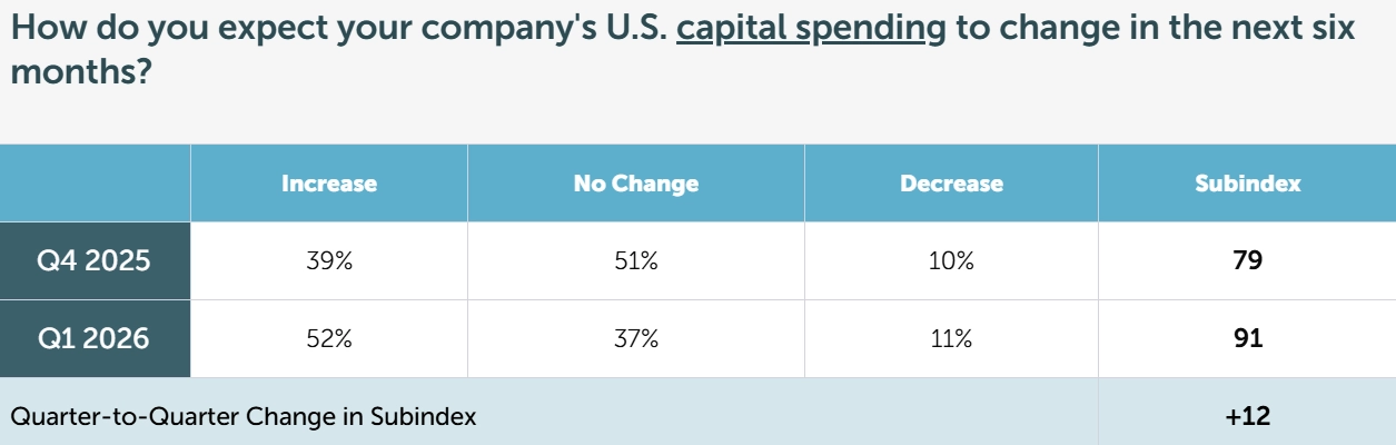 - Plans for capital investment INCREASED +12pts to a value of 91 (signaling further growth from Q4 to Q1)