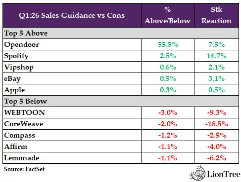 - FY 2026 guidance (where provided) was generally below projections, esp on revenue: Sales guidance for 73% of companies was below consensus expectations while profitability guidance for 53% of companies was below projections