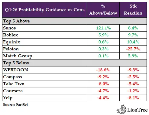 - Q1 2026 guidance (where provided) was vastly below expectations: Sales guidance for 80% of companies in our analysis that provided Q1 sales guidance was below consensus expectations and profitability guidance for 81% of companies that provided profitability guidance missed Street projections