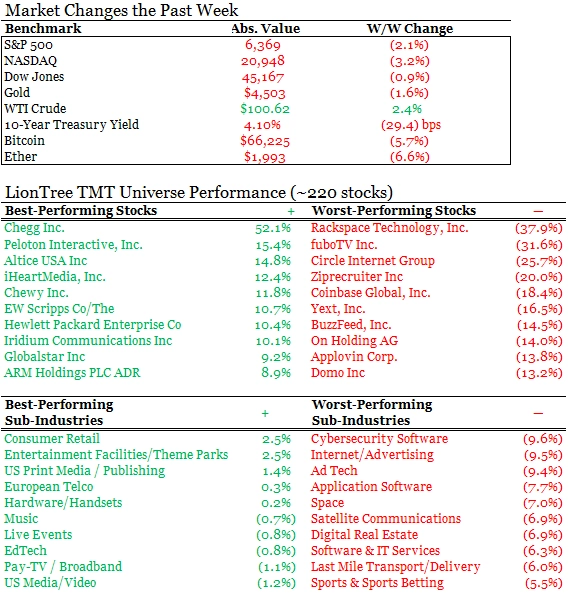 Market volatility spiked this week (the VIX hit 30) on the back of a continuation of geopolitical tensions and concerns which drove Nasdaq down a tough -3.2% and the S&P 500 down -2.1%. Meta falling -11.5% was a major drag in sector (see Theme #2) but selling pressure across the Communications Services sector was broad-based, followed by Tech sector. Outperformance came from Energy and more defensive sectors. Taking a step back, Nasdaq has been down in 10 of the last 11 sessions and is down -12% from its Oct peak, while the S&P 500 locked in its 5th straight weekly decline.