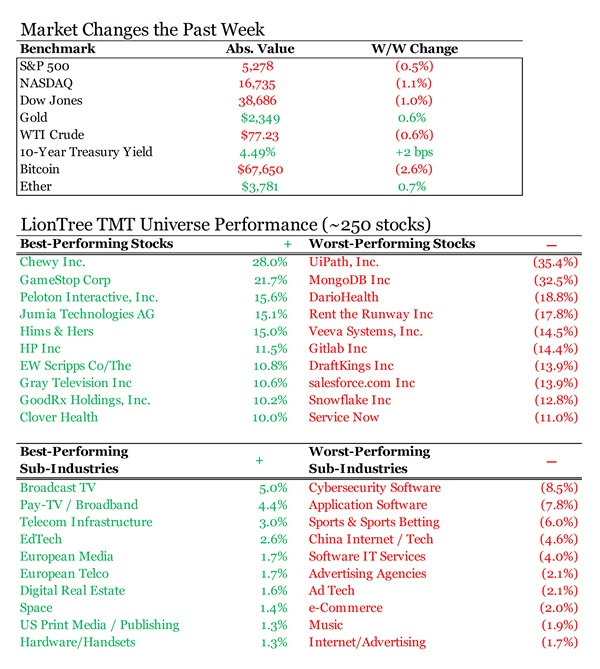 The 5-week streak for Nasdaq gains came to an end this week, with a -1.1% pullback (worse than the S&P 500’s -0.5% decline). Rate cut expectations continue to recede, and the market is now pricing in only ~30bp of cuts by the end of the year…