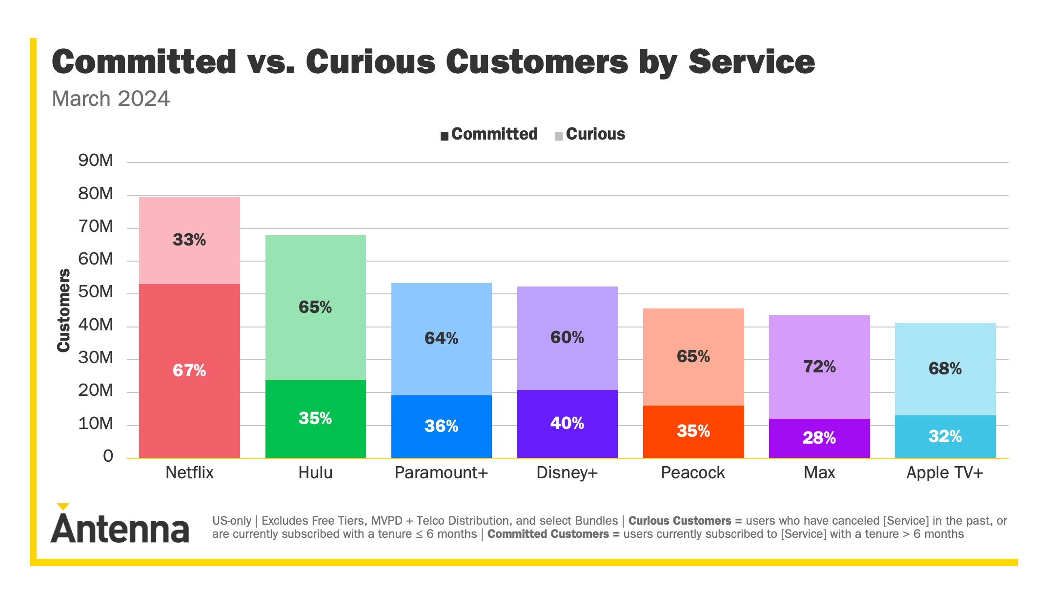 • Netflix has the highest % of Committed Customers, while Max has the highest % of Curious Customers