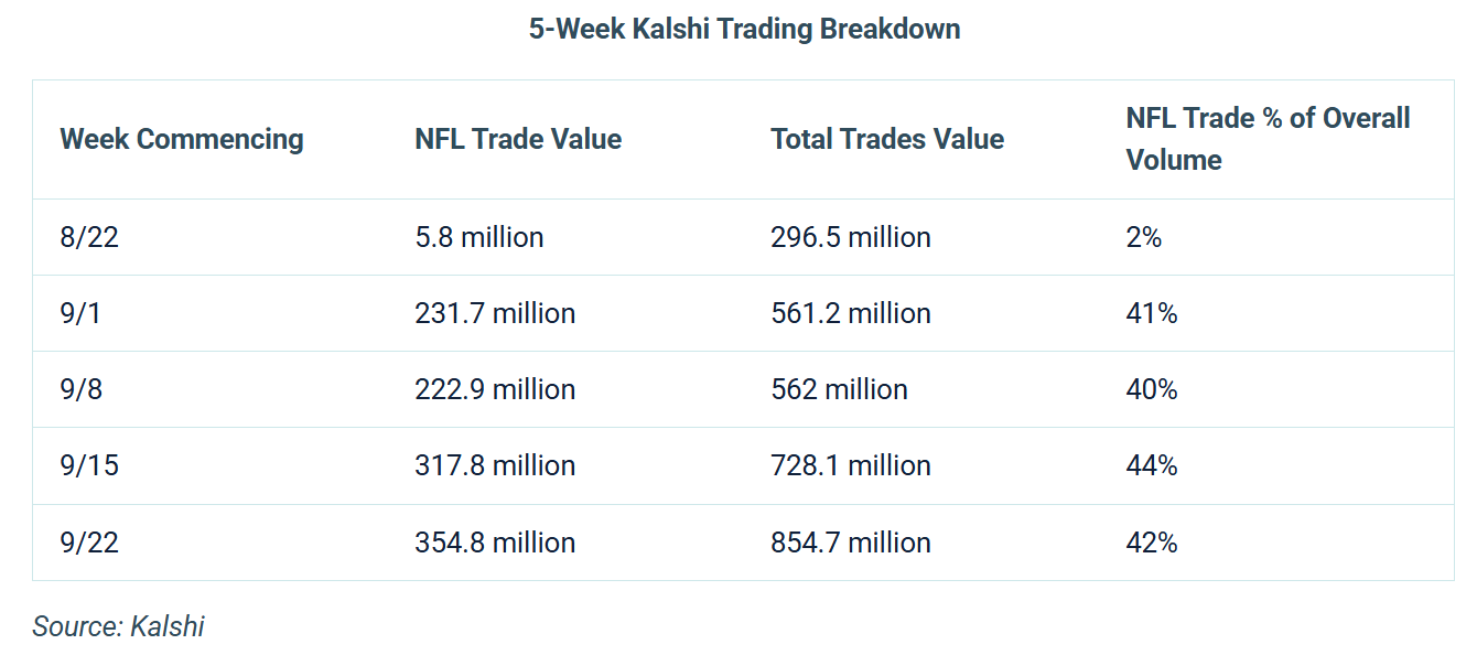 - Of the $538mn traded on Kalshi over the weekend, 98% of volume involved sports contracts and more than 90% of that was related to football