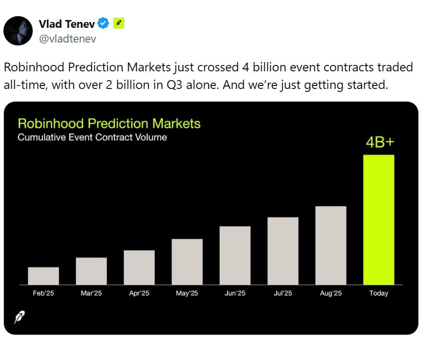 - Robinhood Prediction Markets just crossed 4bn contracts all-time, with 2bn of that occurring in Q3
