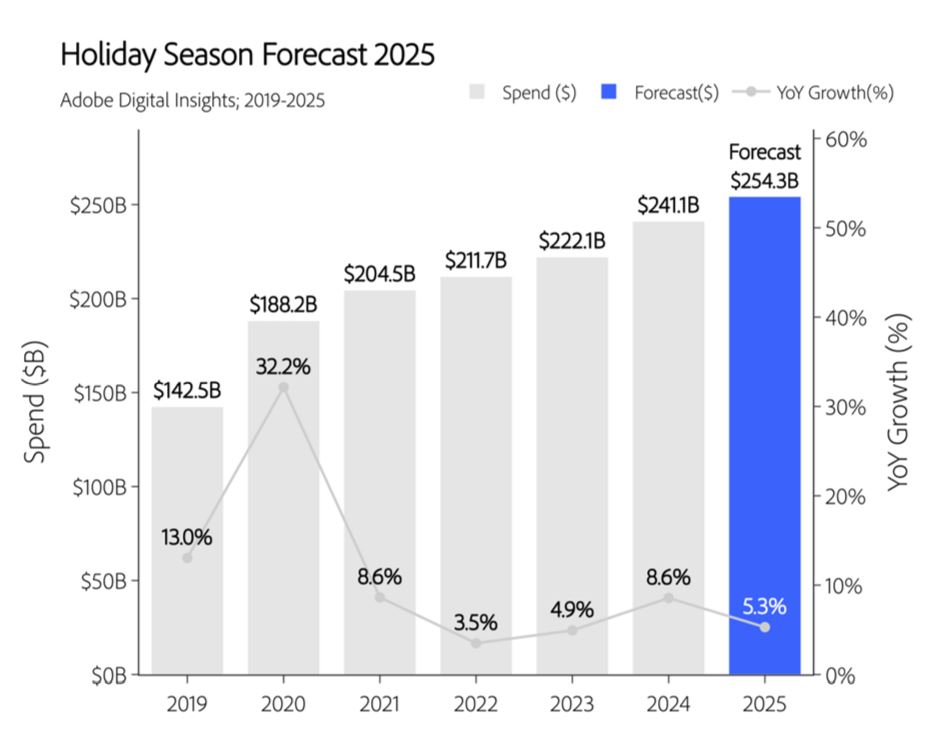 Adobe Forecasts 2025 Holiday Season Online Spending To Cross $250bn But Y/Y Growth Will Normalize (link/link)